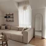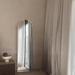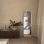 O topo arqueado é um detalhe de design único que adiciona dimensão a qualquer ambiente, conferindo um toque natural. Suas bordas biseladas e estilo minimalista fazem dele o complemento perfeito para sua casa ou escritório. O espelho possui uma fina moldura de ferro e pode ser apoiado no chão ou fixado na parede.
